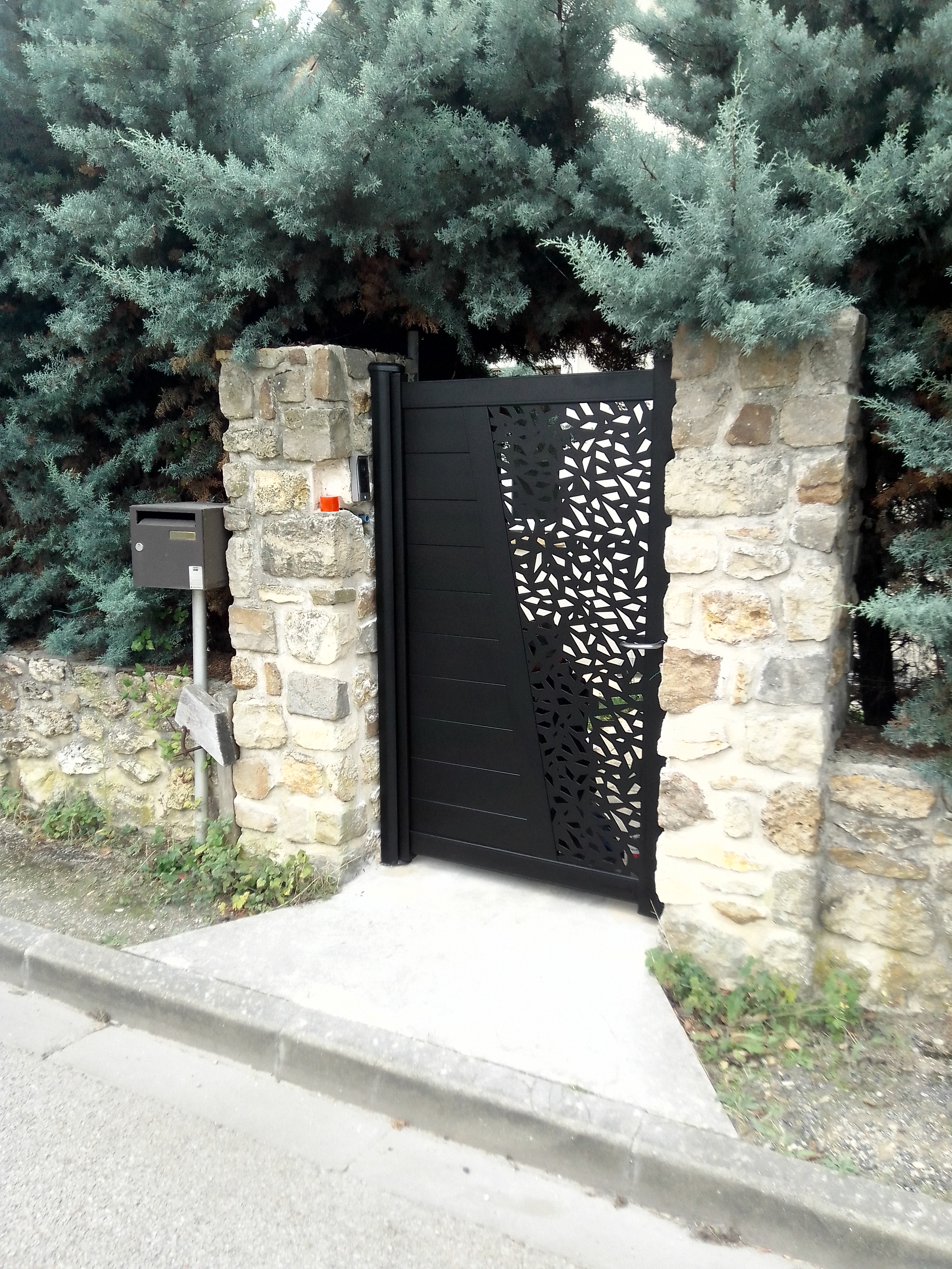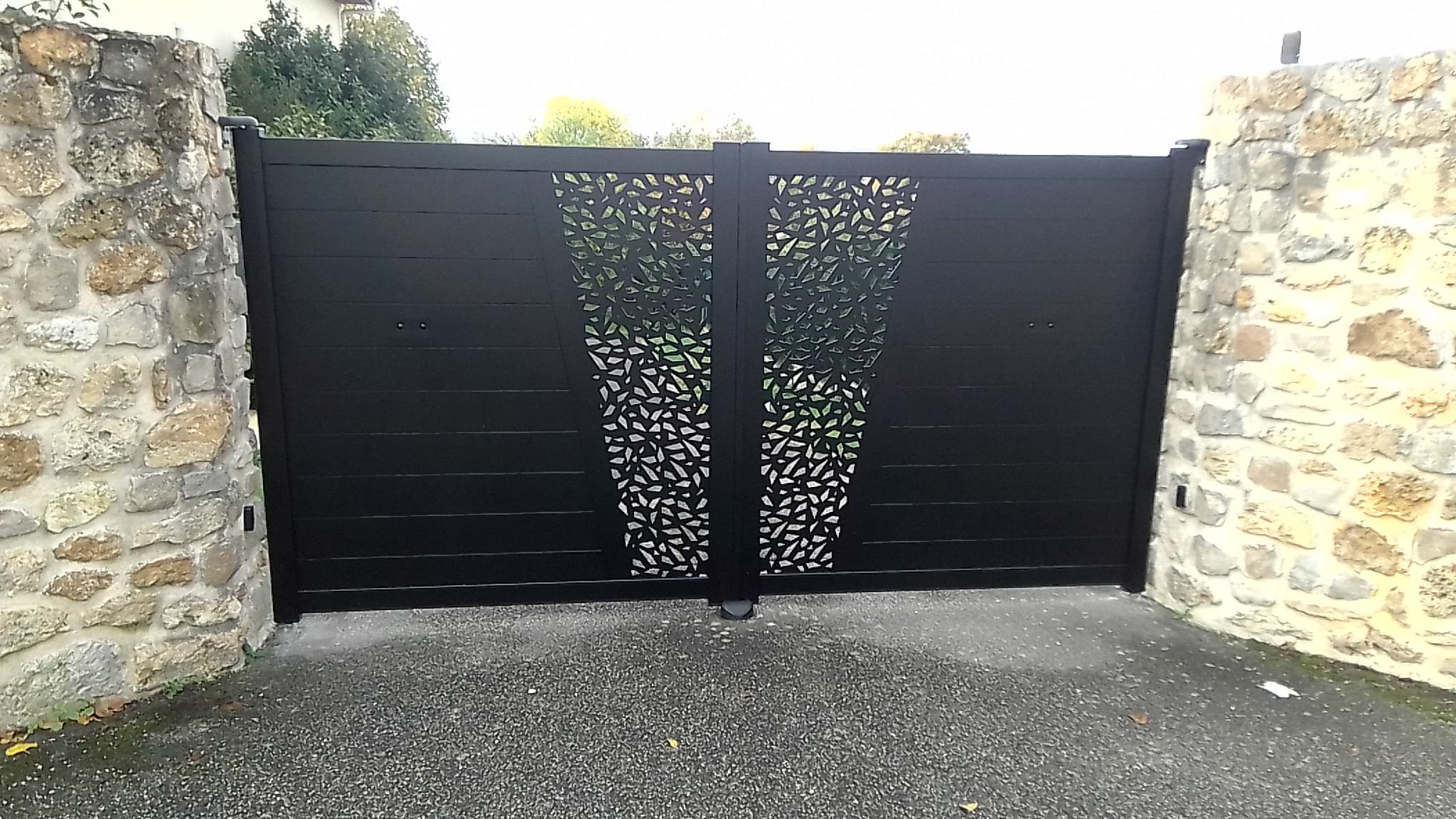 Le motif « fragment », découpé avec précision par laser, apporte une touche graphique et architecturale à l’ensemble. Ni trop ouvert, ni trop fermé, il préserve l’intimité tout en laissant filtrer la lumière et favorisant la circulation de l’air. Cette personnalisation illustre parfaitement notre capacité à transformer un simple portail en une véritable signature esthétique pour la façade.